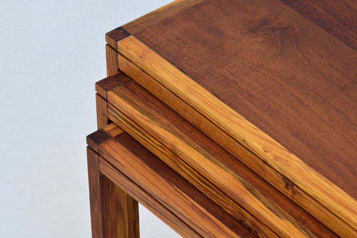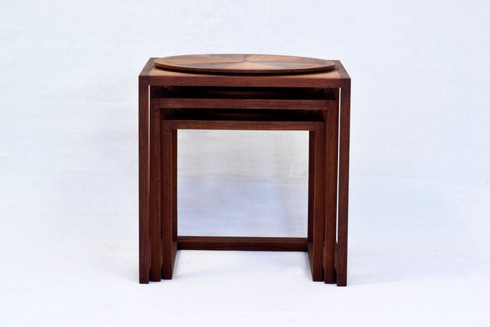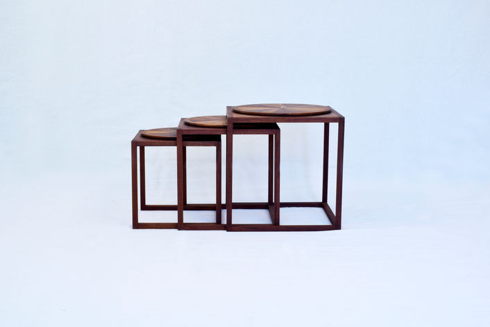 The ubiquitous nest has been reimagined using the constant square section and the rich flat sections of wood. They are light and portable and can be placed as required or returned to their place of repose. Each of the 3 sets is a variation on the theme of simplicity. The last set celebrates the richness of the woods grain and character with a circular top made up of multiple sections contained within a fine frame.